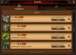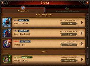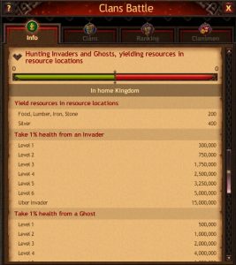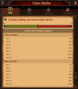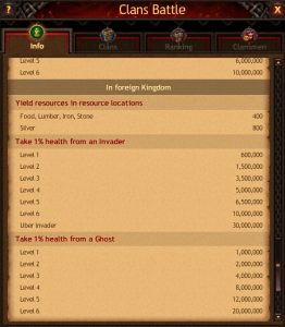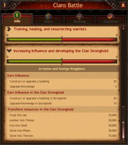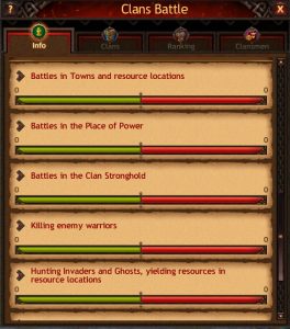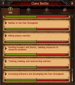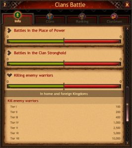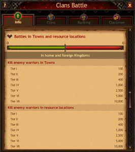 In this picture there is a claim button available, if you see this you want to claim the Great Relocation and Return items. The Great Relocation will be used to jump to the new kingdom once the battle starts. If you scroll down you can see the tasks that are used to award points to the clans that are battling. Once the battle starts, we will be able to get information of how we are doing. The numbers that now show 0:0 will show 4:1 if we are ahead in 4 of the 7 categories or 1: 4 if we are behind in 4 and ahead in 1 category. Green is for our clan red is for the enemy clan